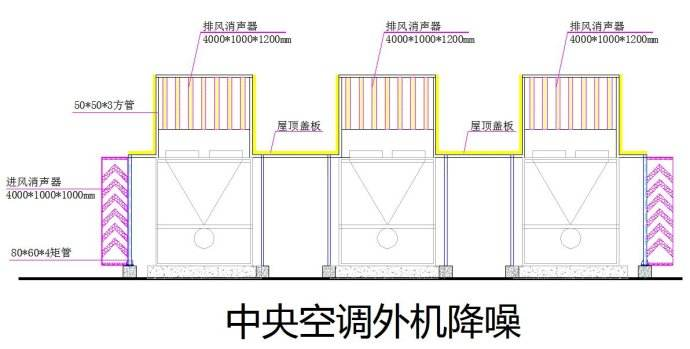1、空調(diào)風(fēng)機(jī)出口處安裝復(fù)合式消聲設(shè)備,消耗風(fēng)機(jī)空氣動(dòng)力性噪聲能量;安裝環(huán)境允許情況下也可在空調(diào)機(jī)外側(cè)安裝隔聲屏障,為周圍住宅營(yíng)造聲影保護(hù)區(qū)域。