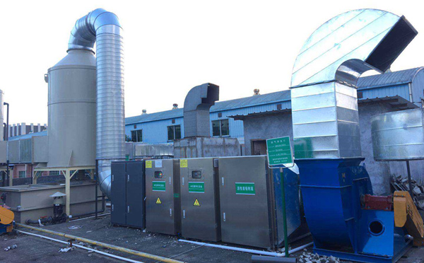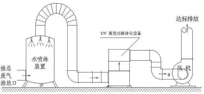 廢氣源→高效吸收塔(吸收掉漆霧、粉塵以及顆粒物為活性炭和光催化提供優(yōu)良的運(yùn)行環(huán)境)→活性炭吸附塔(吸附部分苯甲苯二甲苯)→光催化設(shè)備(紫外線照射空氣產(chǎn)生臭氧氧化廢氣分子利于達(dá)標(biāo)排放)→高壓風(fēng)機(jī)(高壓的吸力作用下持續(xù)將廢氣抽出車間)→煙囪高空排放(也可低空排放)。