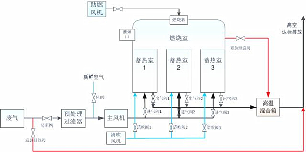 有機(jī)廢氣通過風(fēng)機(jī)輸入蓄熱室進(jìn)行升溫,吸收儲存的熱量,隨后進(jìn)入焚燒室進(jìn)行燃燒,在燃燒的過程中,有機(jī)廢氣被分解成二氧化碳和水。而且,有機(jī)廢氣在燃燒的時候,所釋放的能量,還可以被蓄熱室里的廢氣利用,達(dá)到節(jié)能的目的。