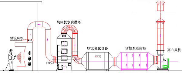 為了使廢氣充分的凈化,達(dá)到排放標(biāo)準(zhǔn),宏森環(huán)保推薦噴淋塔+uv光氧催化+活性炭吸附的組合設(shè)備