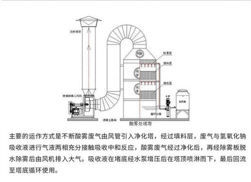 排除的酸霧廢氣→進(jìn)入風(fēng)管→經(jīng)過(guò)酸堿廢氣處理塔→風(fēng)機(jī)→風(fēng)管→達(dá)標(biāo)排放。